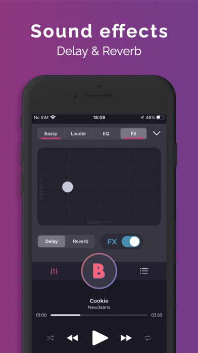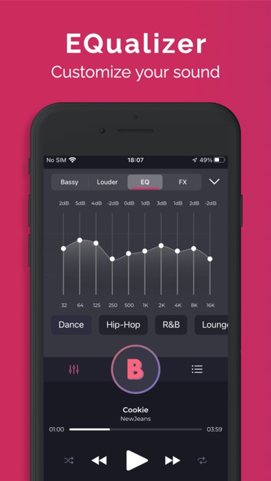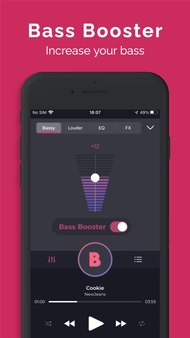 BASSY is an advanced music player able to amplify your bass at a maximum and get a clearer and stronger sound.