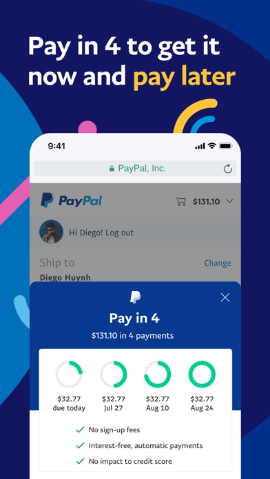 Pay in 4 is available upon approval for purchases of $30 - $1500 and is currently not available to residents of MO or NV. 18 years old or older to apply. PayPal, Inc.: Loans to CA residents are made or arranged pursuant to a CA Finance Lenders Law License. GA Installment Lender Licensee, NMLS #910457. RI Small Loan Lender Licensee. NM residents: Go to paypal.com/us/webapps/mpp/campaigns/newmexicodisclosure. Learn more at paypal.com/payin4